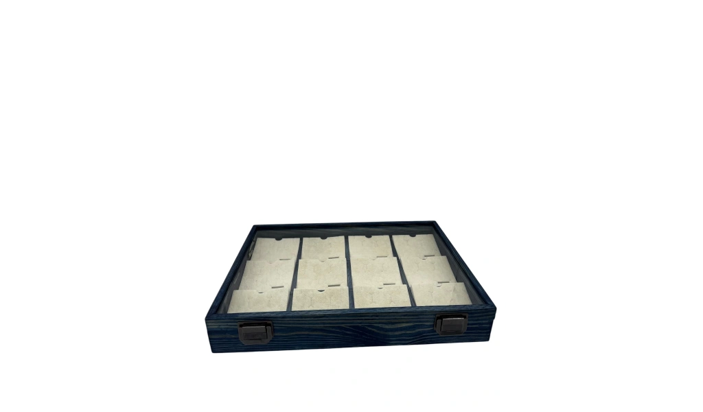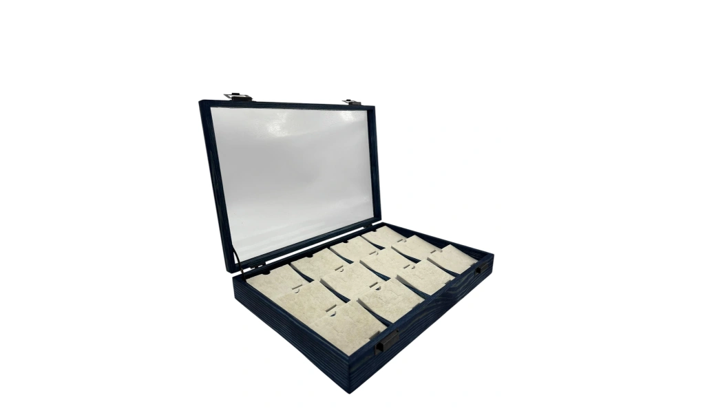 Ahşap El Boyaması Çift Renk 24x34 Cm Cam Kapak Pedli Mini Set Standı 12 Adet Mini Set İçin Kullanıma Uygundur