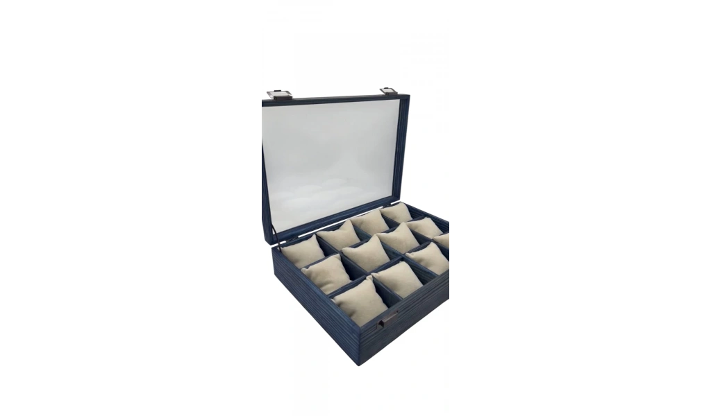Ahşap El Boyaması Çift Renk 24x34 Cm Cam Kapak Yastıklı Stand 12 Yastık Sayesinde Bileklik Kelepçe Saat Gibi Ürünler İçin Kullanıma Uygundur