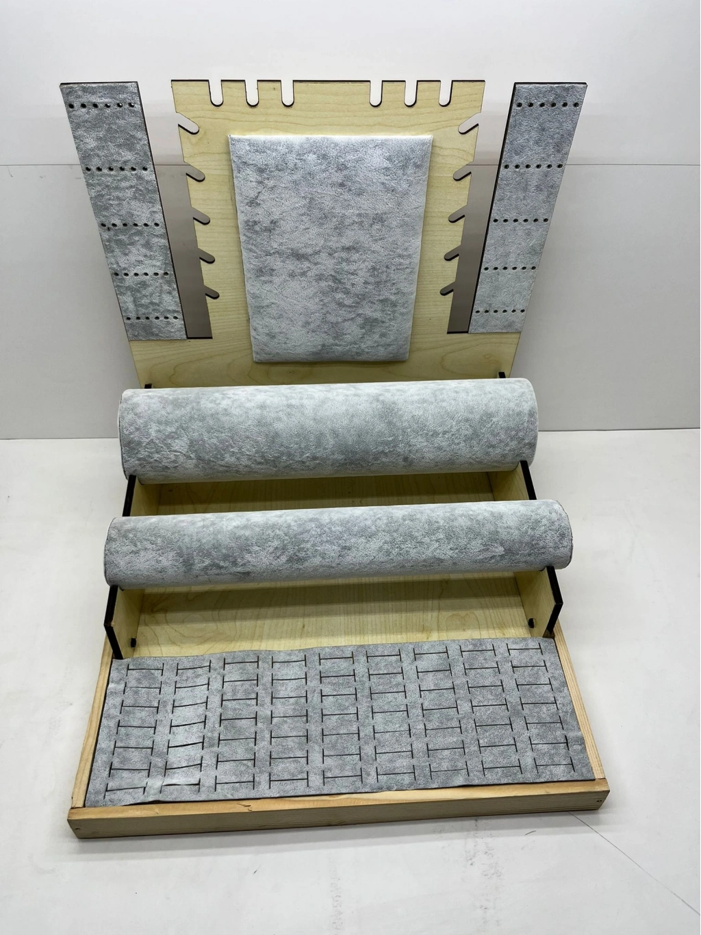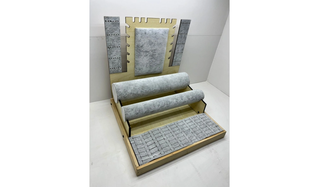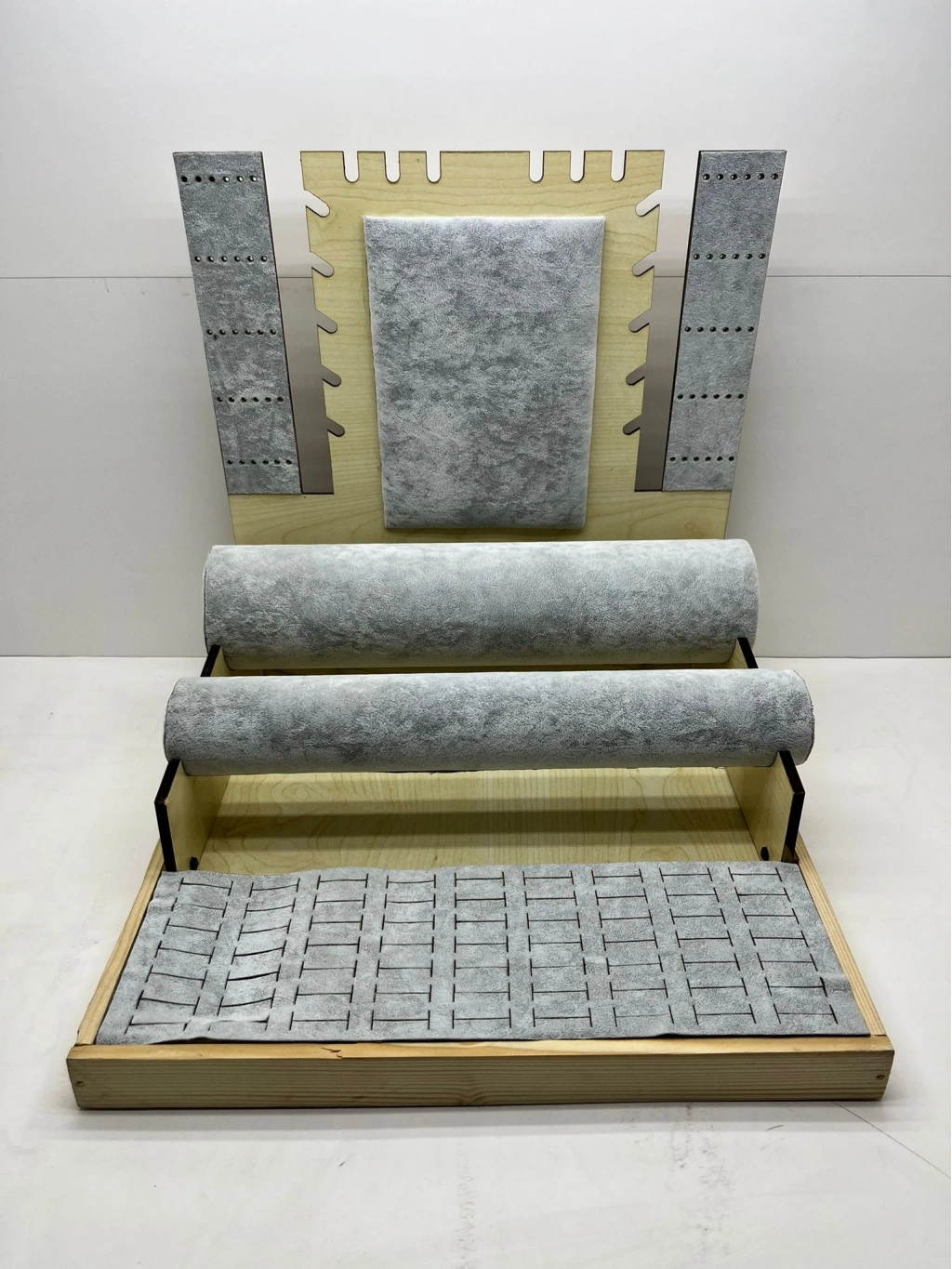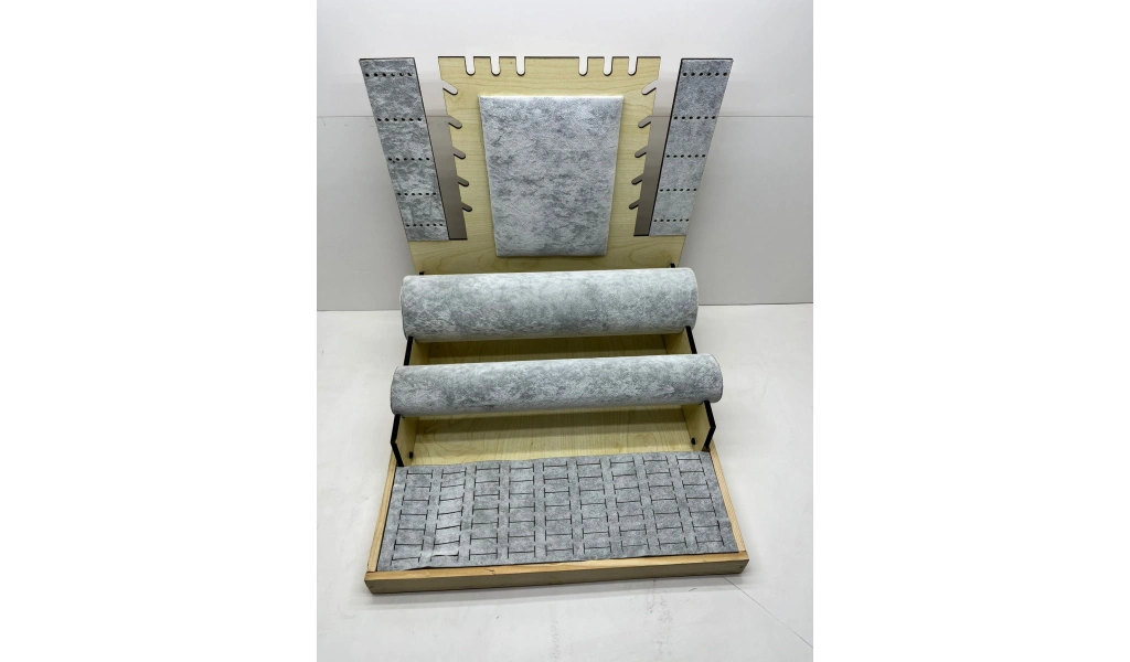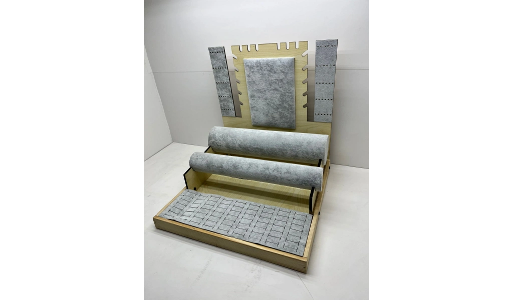 Ürünün Özellikleri ; Malzeme: Ahşap üzerine süet kumaş kaplama ; Renk; Gri ; Boyutları ; Boy:35 cm En :35 cm Yükseklik: 35 cm Kullanım Alanı: 63 adet yüzük,60 adet küpe , 8 adet kolye , 20 adet bileklik saat sergilenebilir.