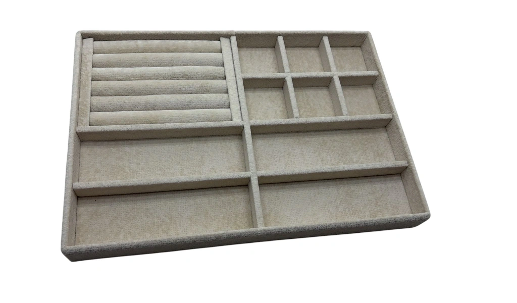 Ürünün Özellikleri : Malzemesi mdf üzerine süet kaplama ; ; Boyutları : Boy: 34 cm En: 24 cm Yükseklik : 3 cm ; ; Renk: Krem ; ; Kullanım Şekli : Bölmeli tarafın bölmeleri 5*5 cm dir. Bölmeli tarafa küpe piersing kolyelerinizi sergileyebilirsiniz. Sosisli kısma yüzük ve kelepçelerinizi sergileyebilirsiniz. 17/6 cm bölmelerede gözlük ve kolyelerınızı sergiliyebilirsiniz