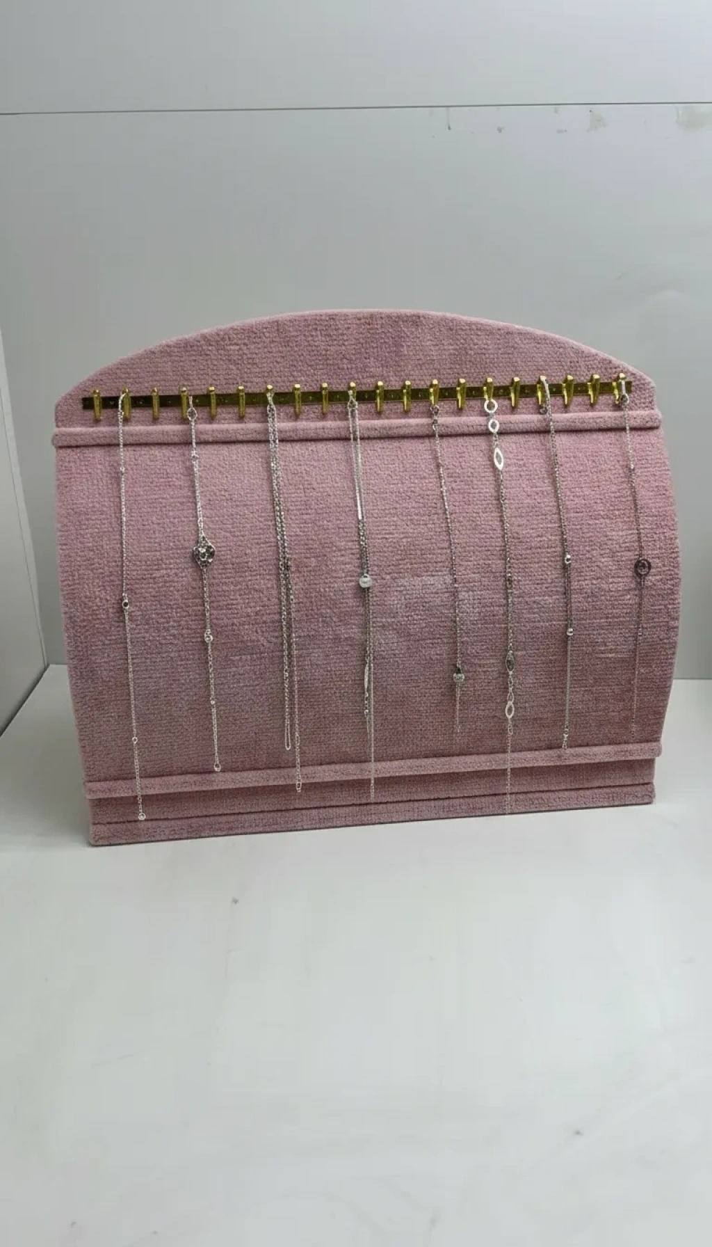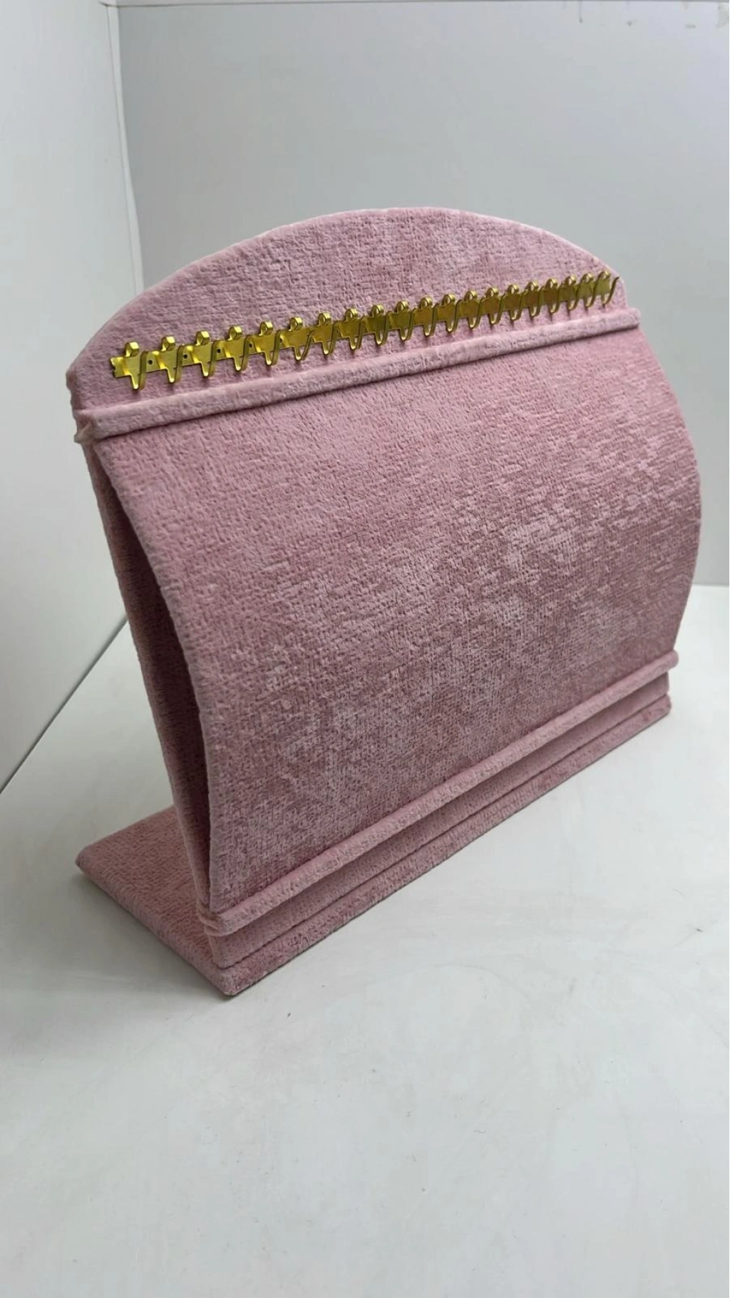 Yerli üretim süet kumaştan üretilmiş, dayanıklı ve şık bir tasarıma sahip; - Pembe renk seçeneğiyle her türlü dekorasyona kolayca uyum sağlar ve estetik bir görünüm sunar; - 20/24 cm ayaklı 20 adet kancalı bileklik sergileme standı, takılarınızı ve aksesuarlarınızı düzenli bir şekilde sergilemenize olanak tanır; - Mücevher, takı ve aksesuarlarınız için ideal bir saklama çözümü sunar; böylece her parça kolayca erişilebilir ve düzenli kalır; - Tek parça halinde gelen bu ürün, montaj gerektirmeyen pratik kullanım imkanı sağlar;