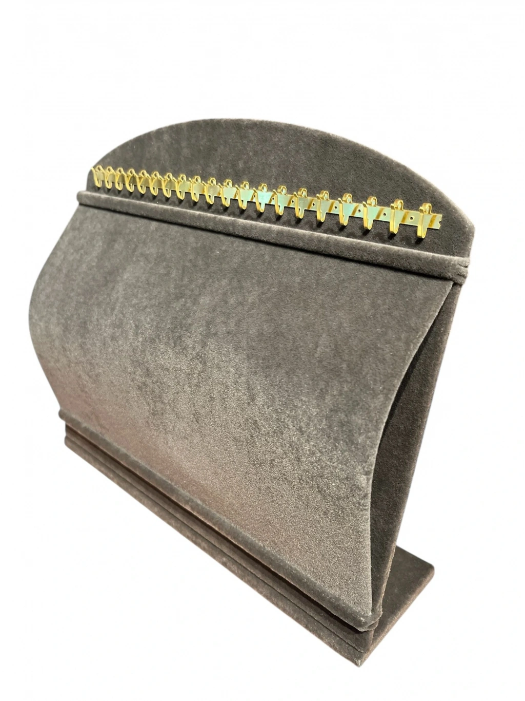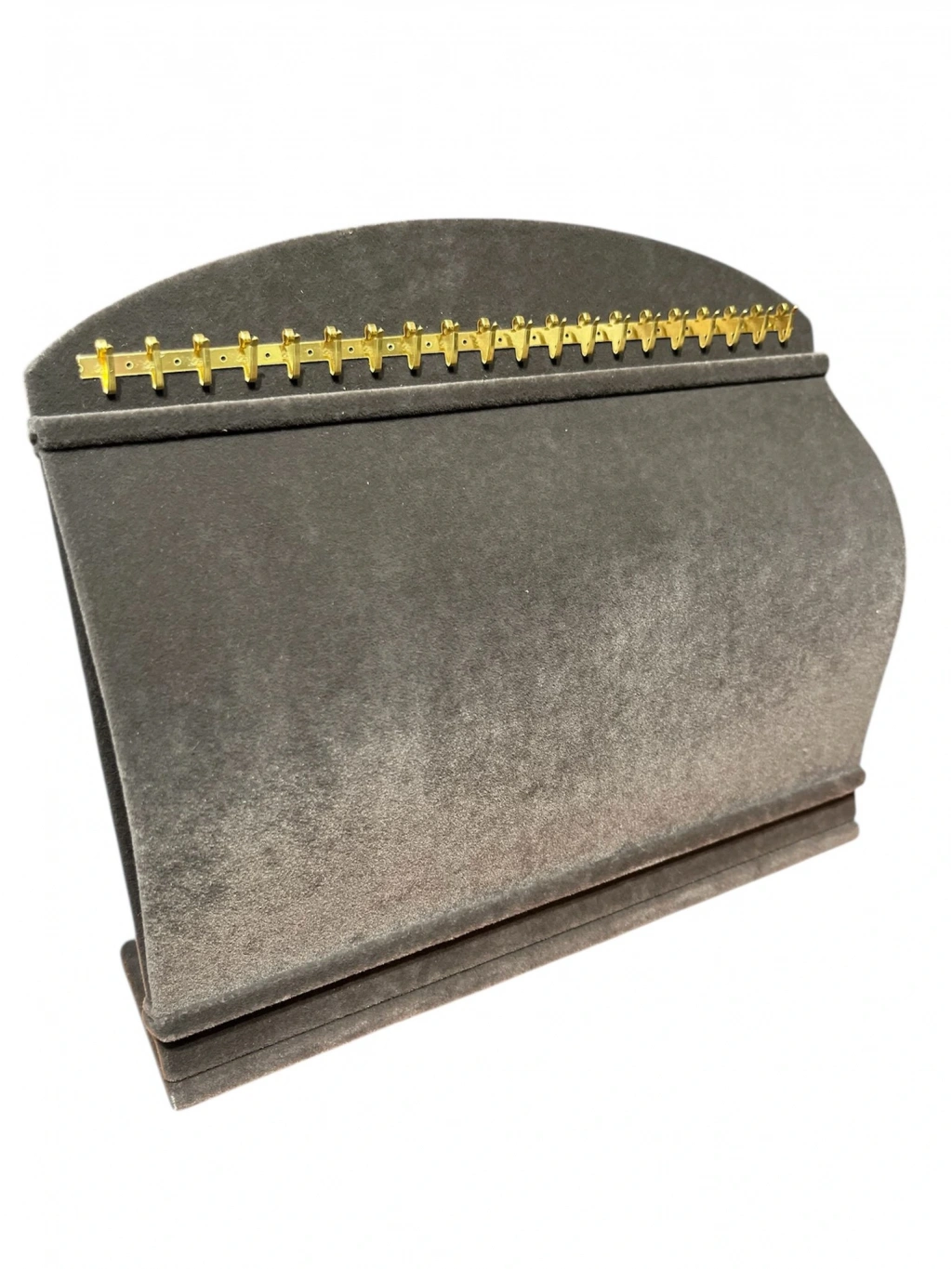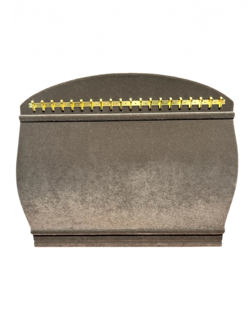 Yerli üretim süet kumaştan üretilmiş, dayanıklı ve şık bir tasarıma sahip; - Füme renk seçeneğiyle her türlü dekorasyona kolayca uyum sağlar ve estetik bir görünüm sunar; - 20/24 cm ayaklı 20 adet kancalı bileklik sergileme standı, takılarınızı ve aksesuarlarınızı düzenli bir şekilde sergilemenize olanak tanır; - Mücevher, takı ve aksesuarlarınız için ideal bir saklama çözümü sunar; böylece her parça kolayca erişilebilir ve düzenli kalır; - Tek parça halinde gelen bu ürün, montaj gerektirmeyen pratik kullanım imkanı sağlar;