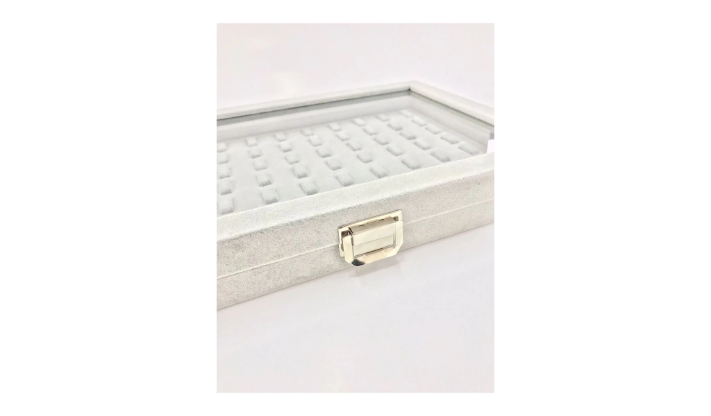 Yeni Cam Kapaklı İmera Deri Kumaş Krem Renk 34 cm / 24 cm Bölmeli Tırnaklı Yüzük Tablası