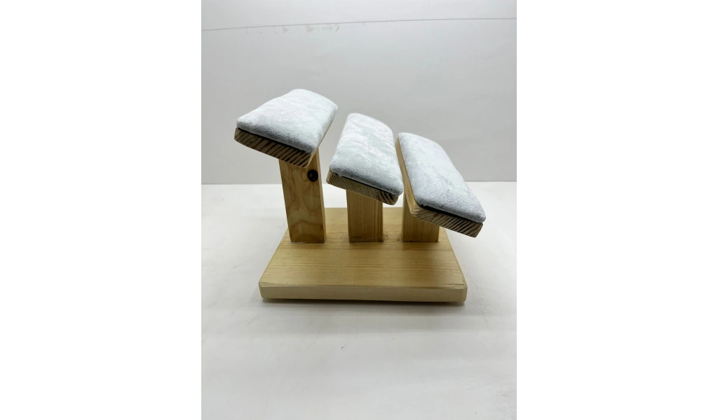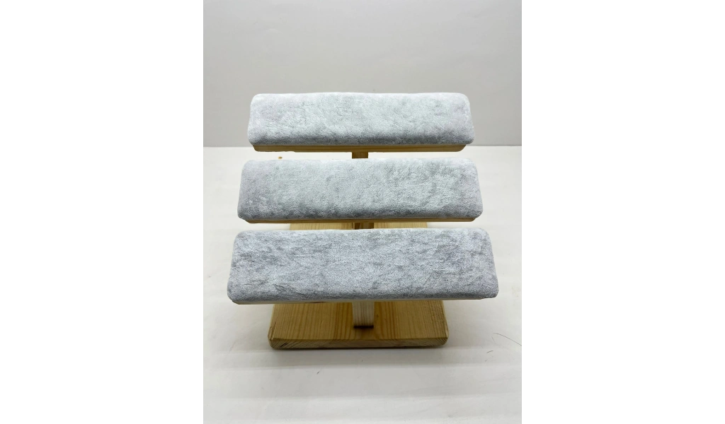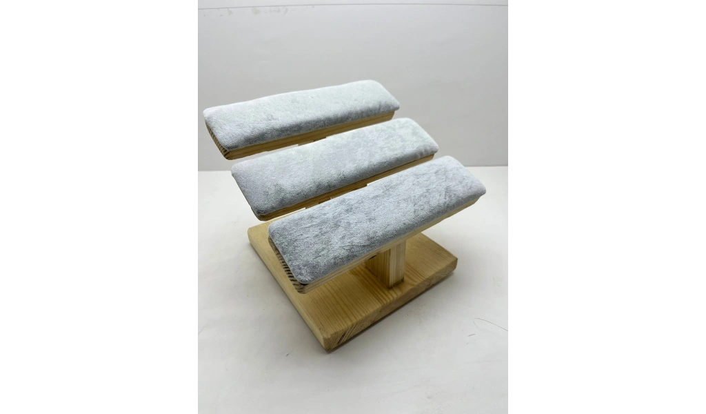 Ürünün Özellikleri ; Malzeme: Ahşap üzerine süet kumaş kaplama ; Renk; Gri ; Boyutları ; Boy:21 cm En :19 cm Kullanım Alanı : Bilezik,kelepçe,bileklik,saat sergileme ve çekim aksesuarı.