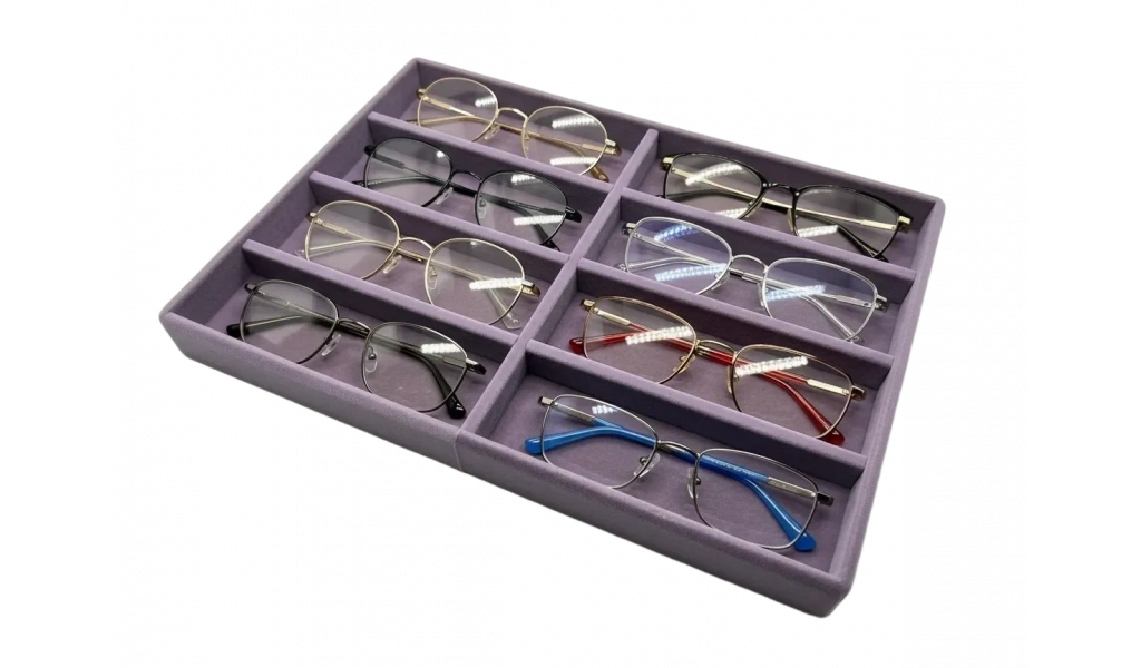 Ürünün özellikleri ; Malzeme: Ahşap üzerine süet kumaş kaplama ; Renk; Lila ; Boyutları ; Boy: 34 cm En: 24 cm Yükseklik: 3cm Kullanım alanı : 8 adet gözlük ve takı sergileme ve çekim tablası