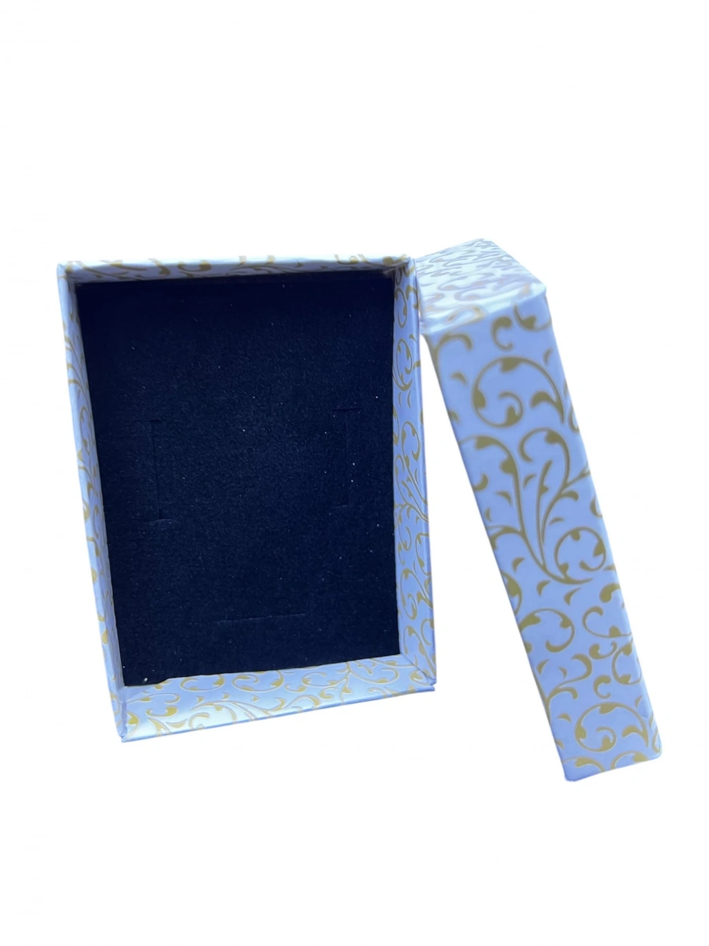 Ürünün özellikleri : Malzemesi mukavva karton; boyutları : Boy: 8 cm en : 6 cm ; Renk: Beyaz Gold Çizgiliı ; kullanım şekli : 48 Adet üçlü set süngerli takı kutusu