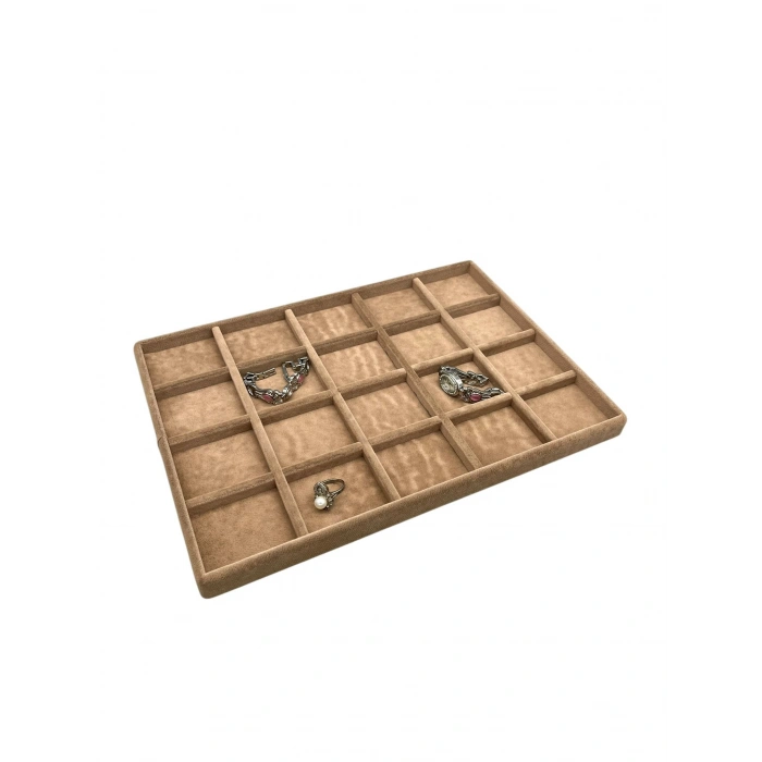 Üsküp Model Süet Kumaş Sütlü Kahve Renkli 34/24 cm 20 Bölmeli Takı Sergileme Tablası