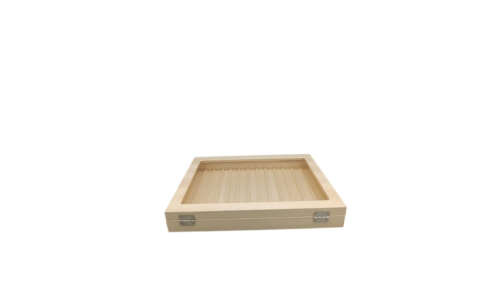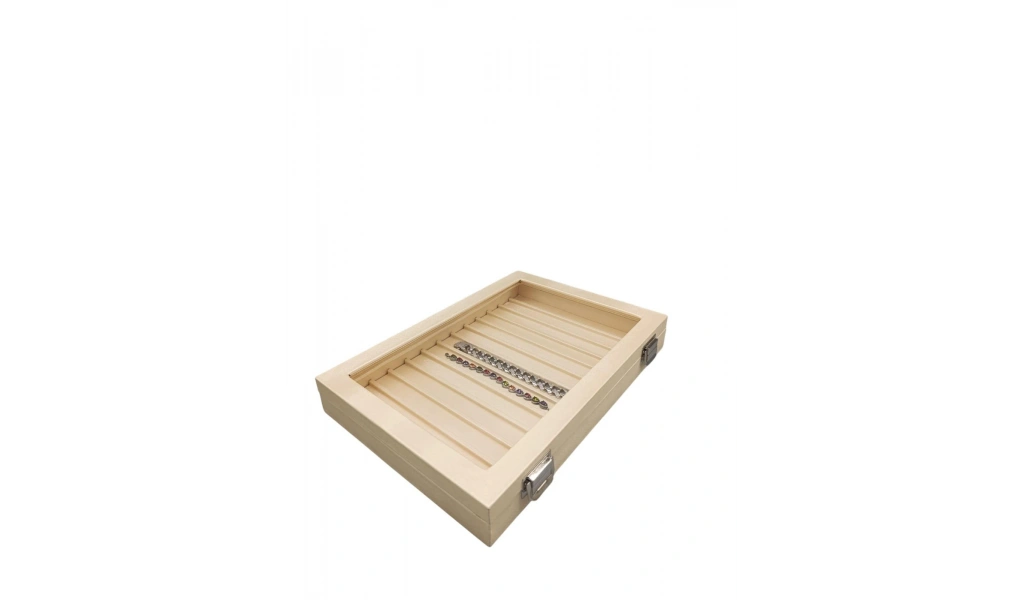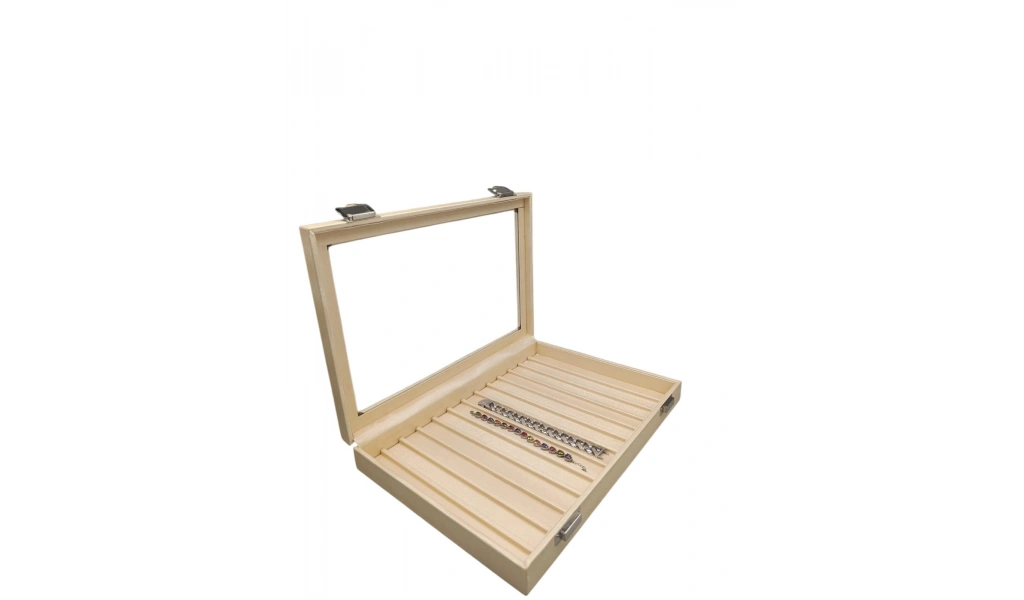Yeni Cam Kapaklı İmera Deri Kumaş Krem Renk 34 cm / 24 cm Bölmeli Kolye-Bileklik Tablası