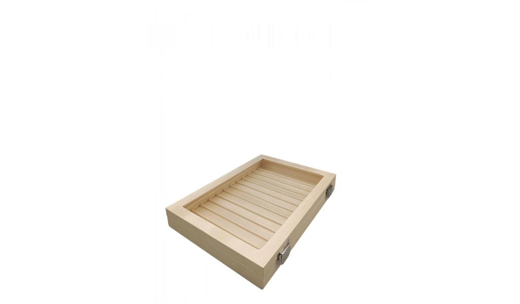 Yeni Cam Kapaklı İmera Deri Kumaş Krem Renk 34 cm / 24 cm Bölmeli Tırnaklı Yüzük Tablası