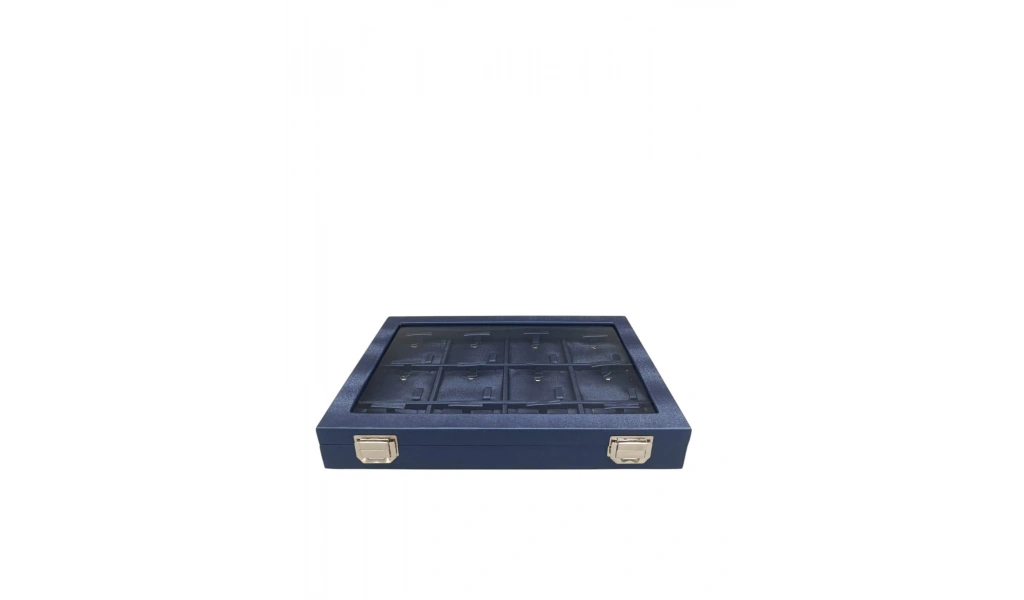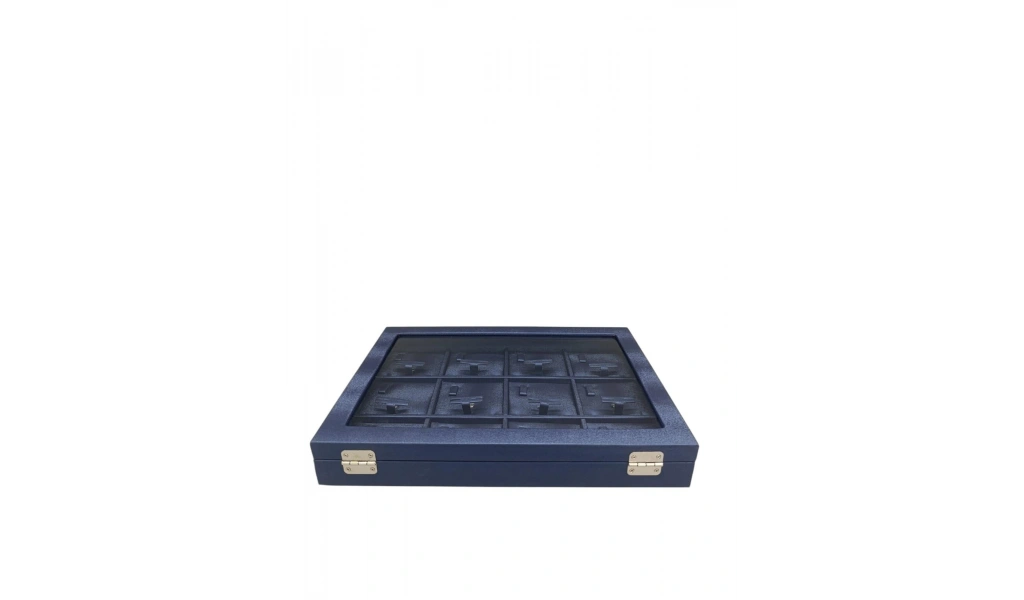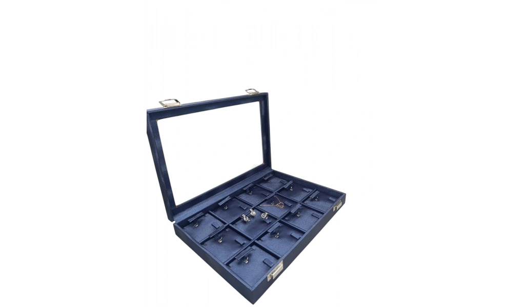 Yeni Cam Kapaklı İmera Deri Kumaş Lacivert Renk 34 cm / 24 cm Bölmeli Kolye Tablası