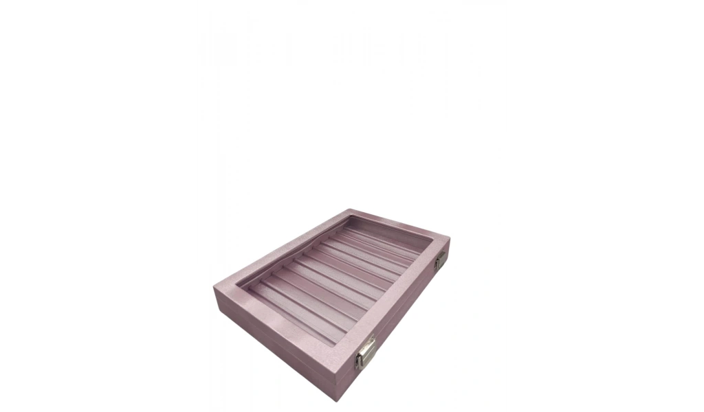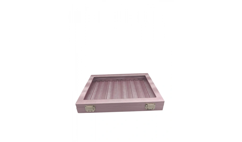 Yeni Cam Kapaklı İmera Deri Kumaş Pembe Renk 34 cm / 24 cm Bölmeli Tırnaklı Yüzük Tablası