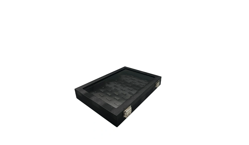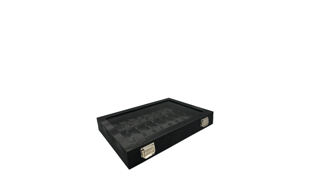 Yeni Cam Kapaklı İmera Deri Kumaş Siyah Renk 34 cm / 24 cm Bölmeli Kolye-Bileklik Tablası