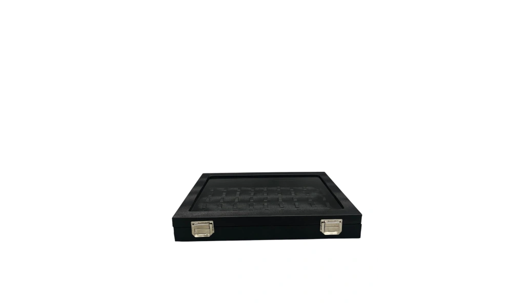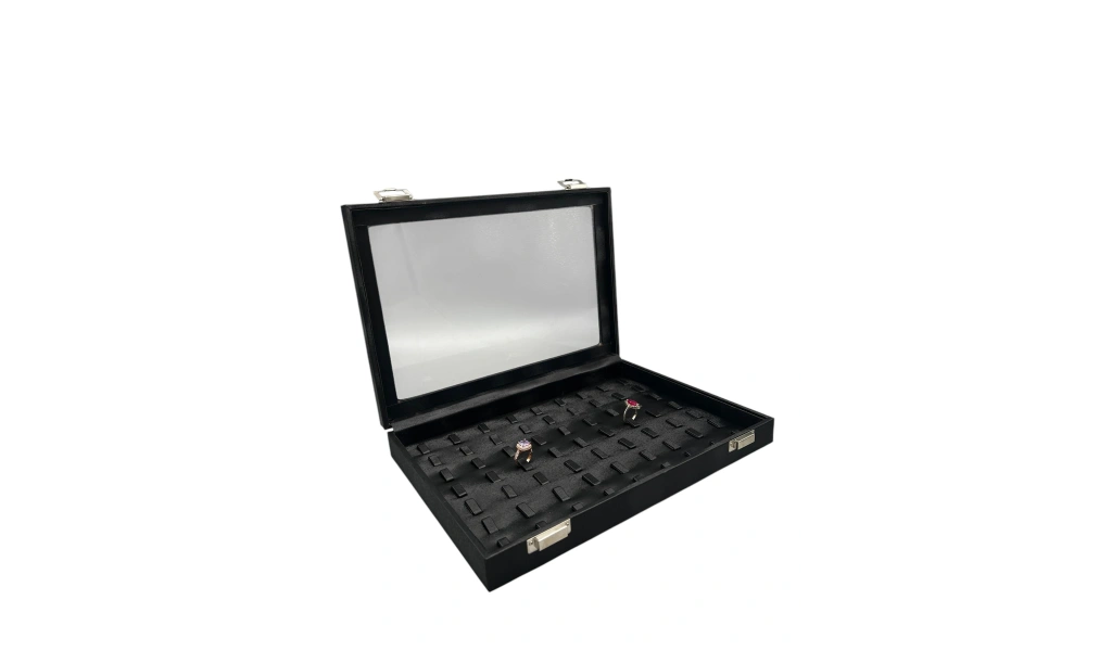 Yeni Cam Kapaklı İmera Deri Kumaş Siyah Renk 34 cm / 24 cm Tırnaklı Yüzük Tablası