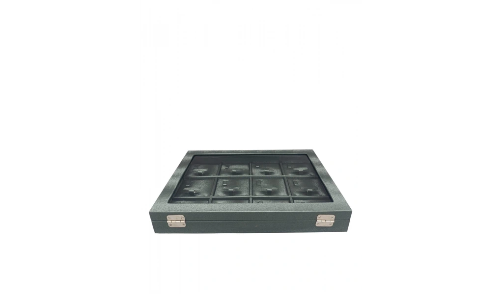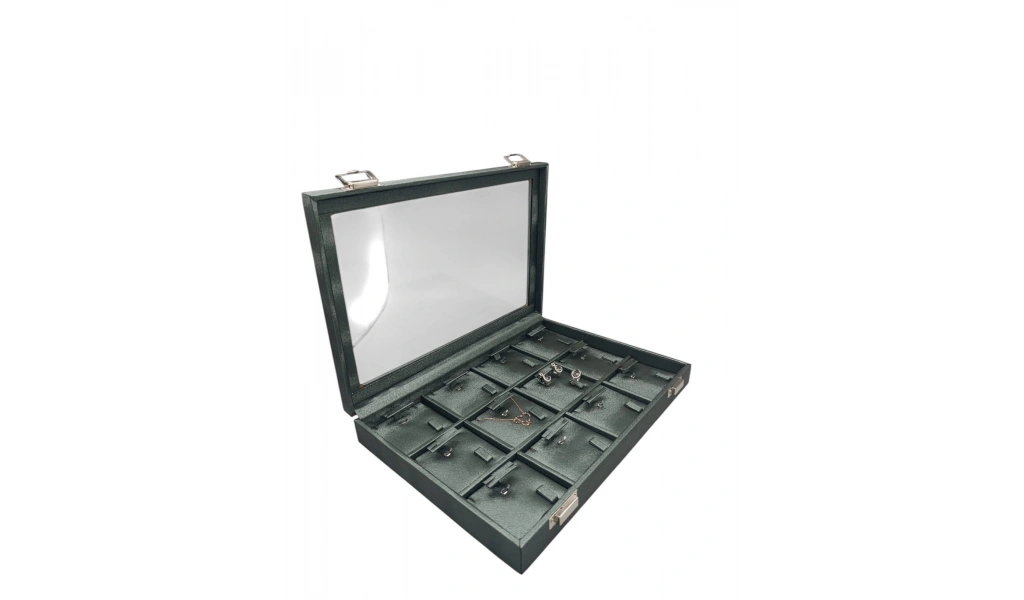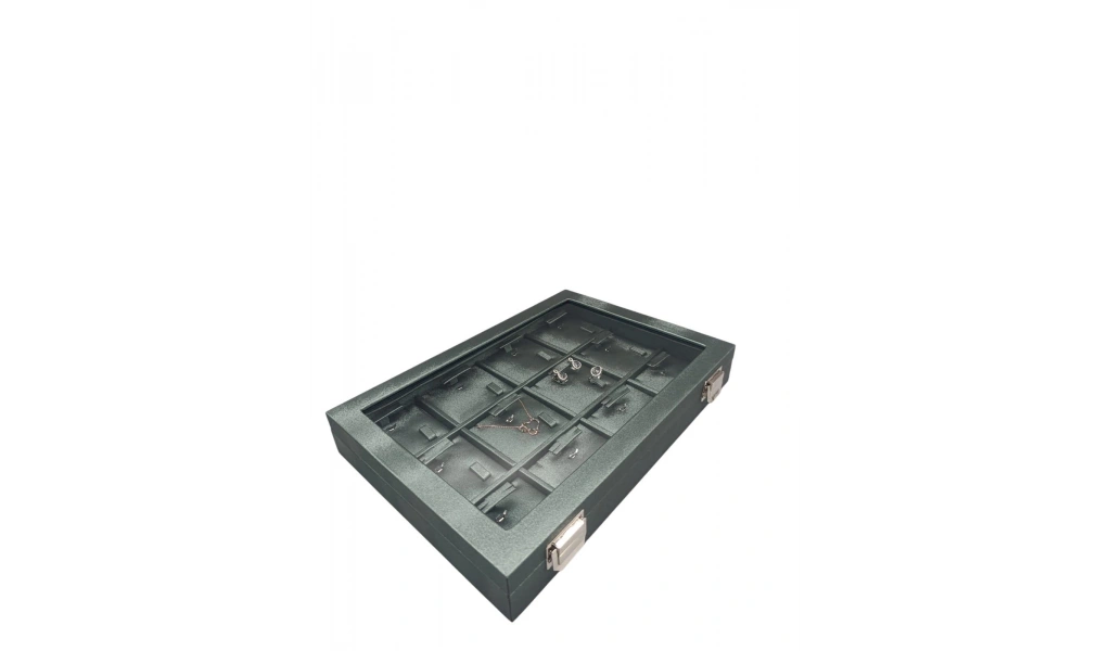 Yeni Cam Kapaklı İmera Deri Kumaş Yeşil Renk 34 cm / 24 cm Bölmeli Kolye Tablası