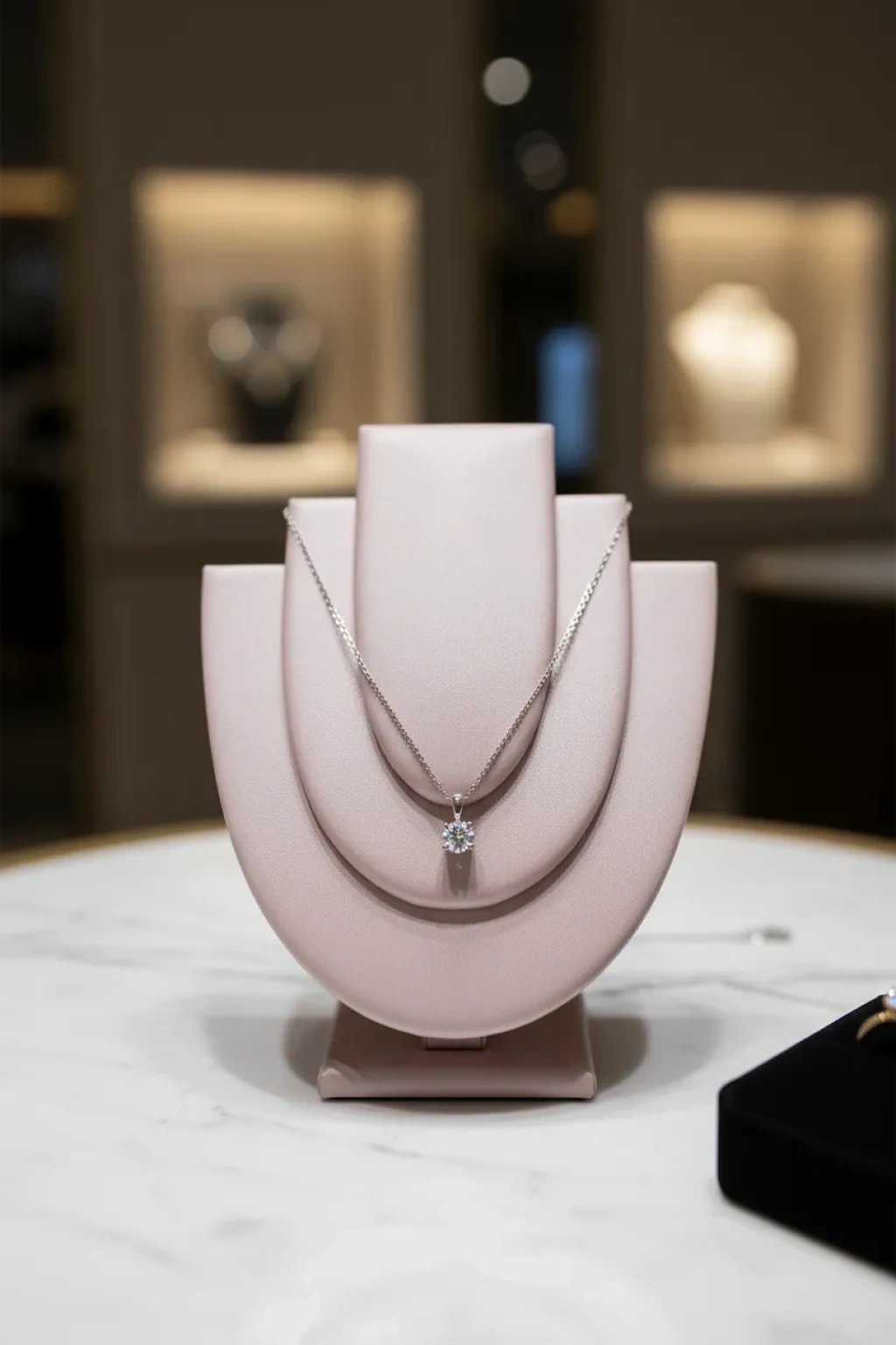 • Ürünün Özellikleri ; Malzeme: plastik üzerine İmera deri kumaş kaplama ; Renk : Pembe ; Boyutları ; Boy:25 cm En 21 cm Kullanım Alanı : Kolye , Gerdanlık , Zincir sergilemek ve fotoğraf çekimi için idealdir. ; Arkasında bulunan lastik sayesinde sergilemiş olduğunuz ürün manken üzerine kayma yapmaz ;