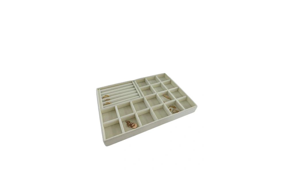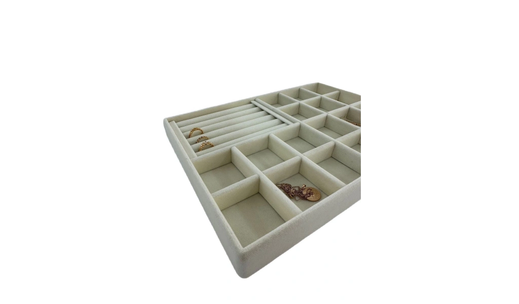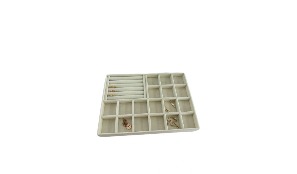 Ürünün Özellikleri : Malzemesi mdf üzerine süet kaplama ; ; Boyutları : Boy: 34 cm En: 24 cm Yükseklik : 3 cm ; ; Renk: Krem ; ; Kullanım Şekli : Bölmeli tarafın bölmeleri 5*5 cm dir. Bölmeli tarafa küpe piersing kolyelerinizi sergileyebilirsiniz. Sosisli kısma yüzük ve kelepçelerinizi sergileyebilirsiniz.