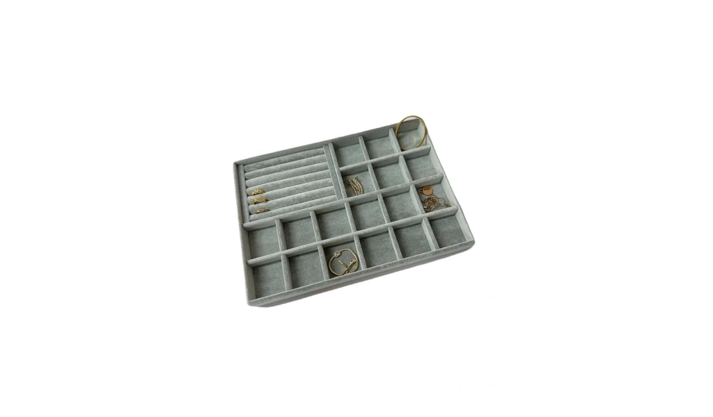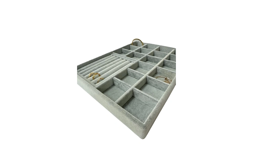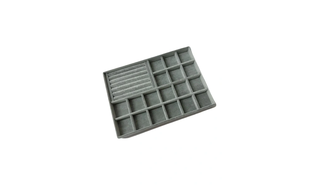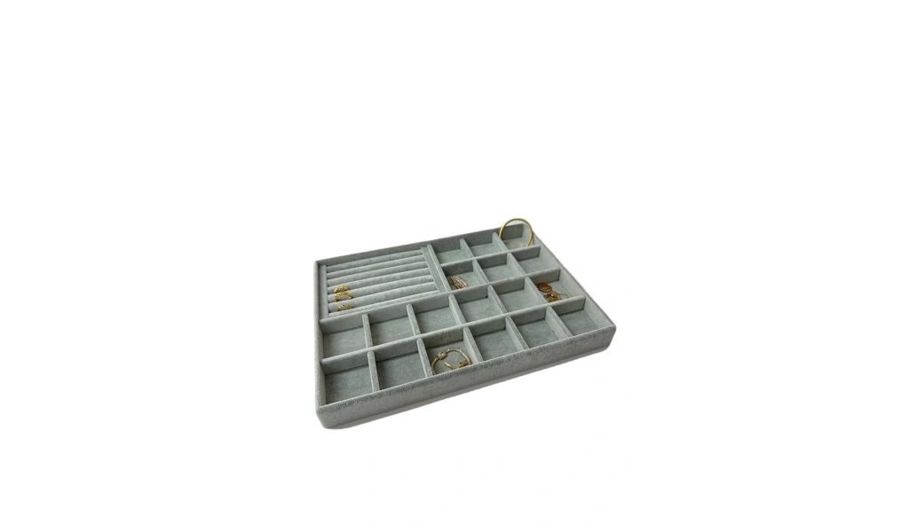 Ürünün Özellikleri : Malzemesi mdf üzerine süet kaplama ; ; Boyutları : Boy: 34 cm En: 24 cm Yükseklik : 3 cm ; ; Renk: Gri ; ; Kullanım Şekli : Bölmeli tarafın bölmeleri 5*5 cm dir. Bölmeli tarafa küpe piersing kolyelerinizi sergileyebilirsiniz. Sosisli kısma yüzük ve kelepçelerinizi sergileyebilirsiniz.