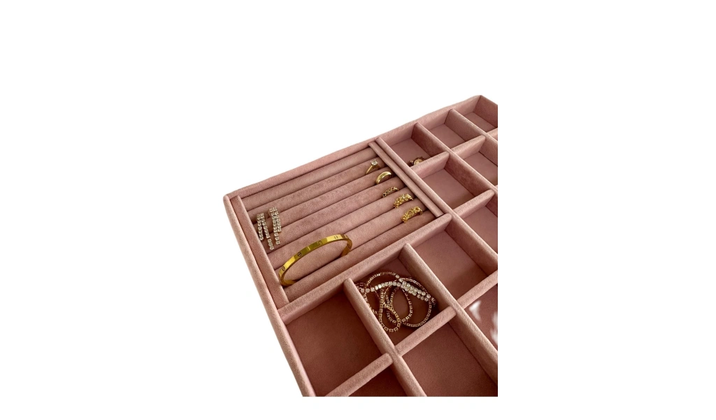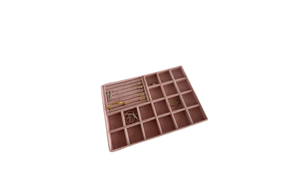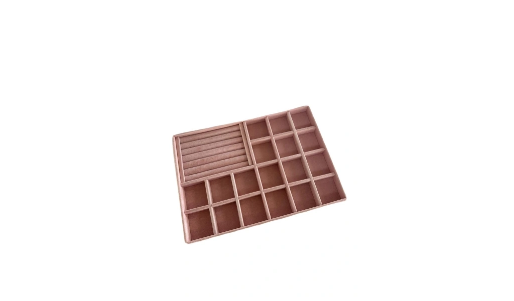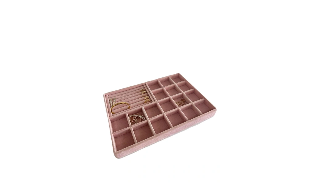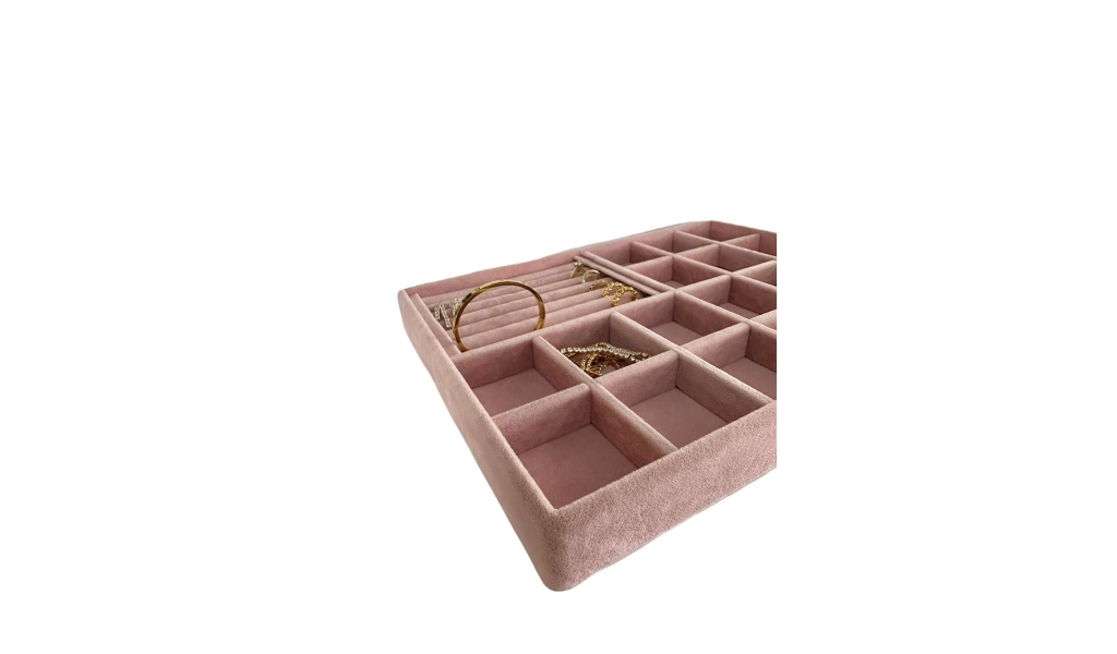 Ürünün Özellikleri : Malzemesi mdf üzerine süet kaplama ; ; Boyutları : Boy: 34 cm En: 24 cm Yükseklik : 3 cm ; ; Renk: Pembe ; ; Kullanım Şekli : Bölmeli tarafın bölmeleri 5*5 cm dir. Bölmeli tarafa küpe piersing kolyelerinizi sergileyebilirsiniz. Sosisli kısma yüzük ve kelepçelerinizi sergileyebilirsiniz.
