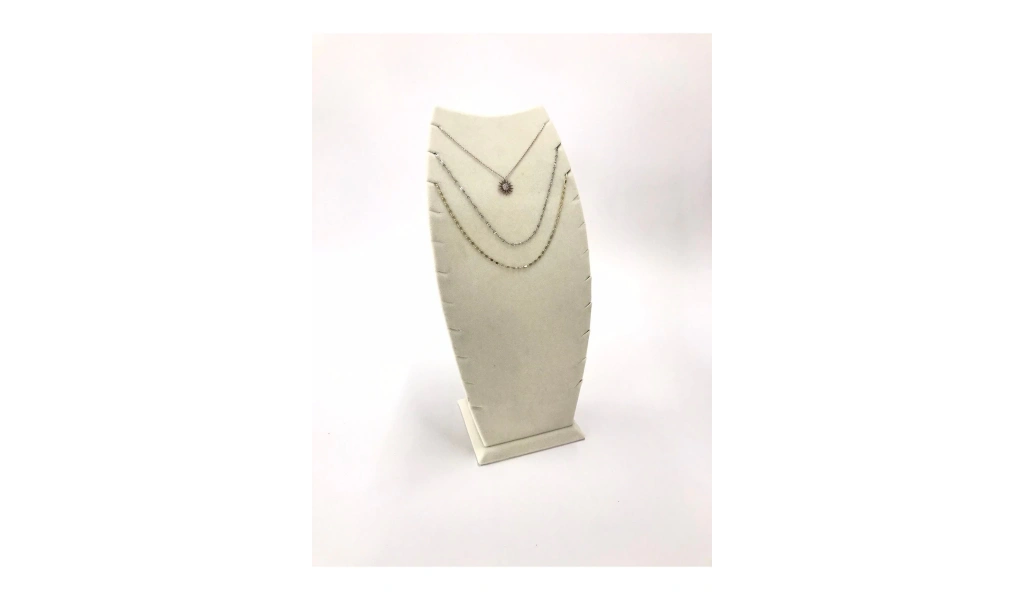 Malzemesi Mukavva üzerine süet kaplama · Boyutları : Boy: 25 cm En: 12 cm · Renk: Krem · Kullanım Şekli : 11 Adet kolye veya zincir sergileme yapabilirsiniz. ;