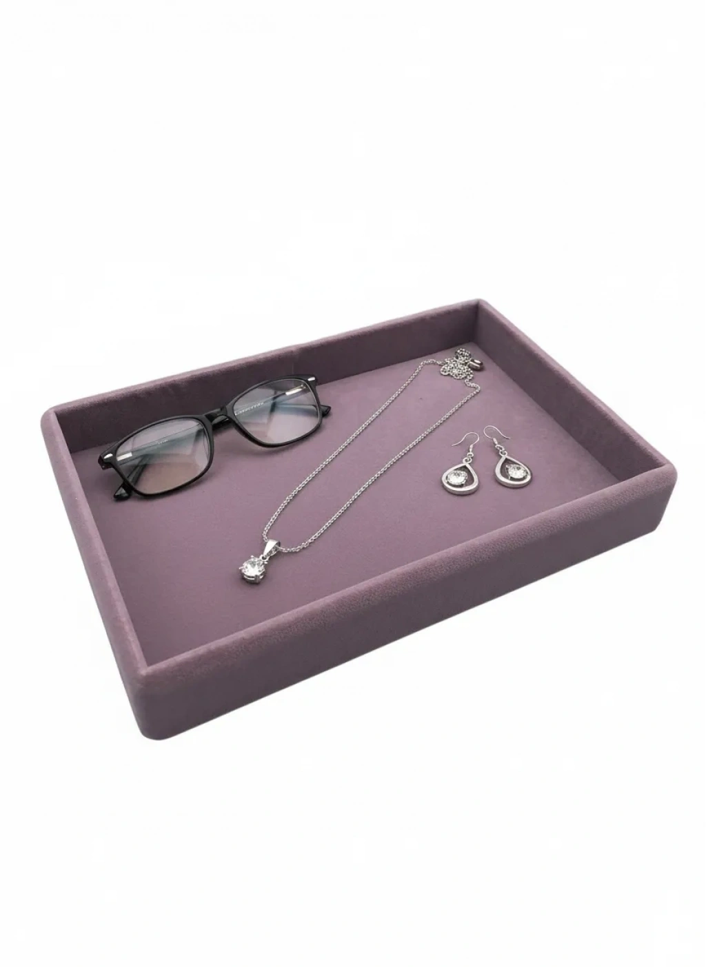 Ürünün Özellikleri: Malzeme: Mdf üzerine süet kumaşı Boyutları : Boy: 14 cm En: 22 cm Yukseklik: 3 cm Renk: Lila  Açıklama : Takı sergileme saklama tablası