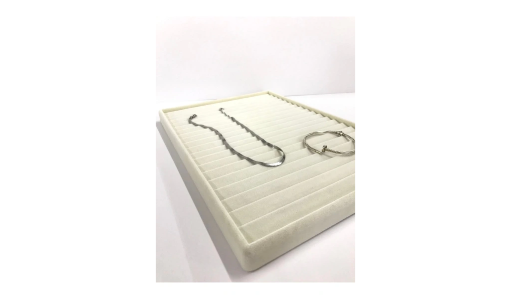 Yerli üretim süet kumaştan üretilmiş, dayanıklı ve şık bir tasarıma sahip; Krem rengiyle her türlü çekmece düzenine uyum sağlar ve estetik bir görünüm sunar; 34/24 cm boyutlarındaki kademeli yapısı sayesinde farklı boyutlardaki bileklikler ve kolyeler için ideal saklama çözümüdür; Çekmece içinde kolayca yerleştirilebilir ve gerektiğinde çıkarılabilir özelliğiyle pratik kullanım sağlar;