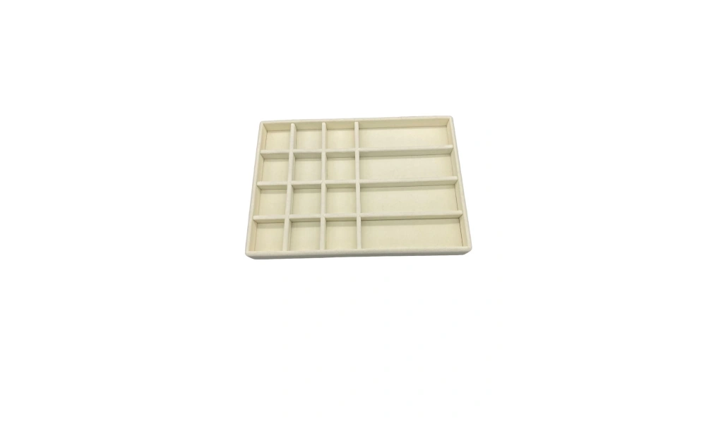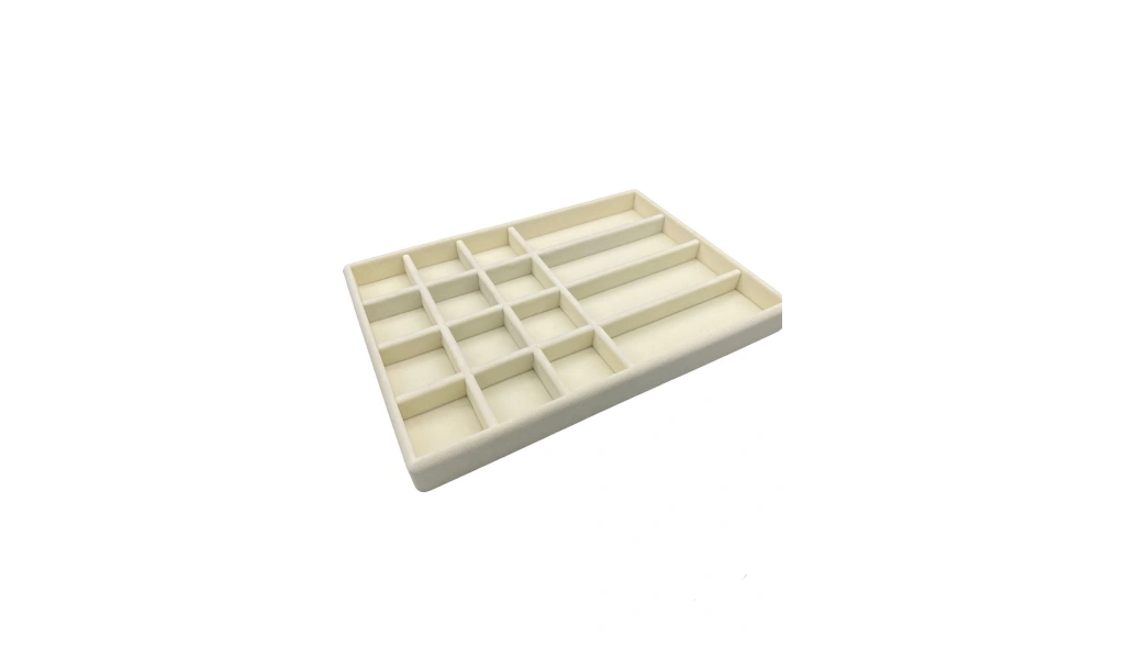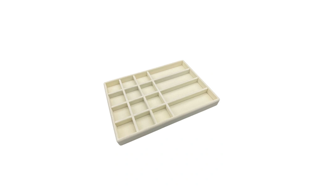Ürünün Özellikleri : Malzemesi mdf üzerine süet kaplama ; Boyutları : Boy: 34 cm En: 24 cm Yükseklik : 3 cm ; Renk: Krem ; Kullanım Şekli : 12 bölmeleri 5 cm - 5 cm olup küpe yüzük kolye piersing sergilenebilir . 4 bölmeleri 16 cm - 5,5 cm olup gözlük ve saatlerinizi sergileyebilirsiniz. ;