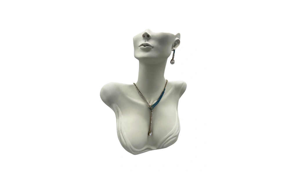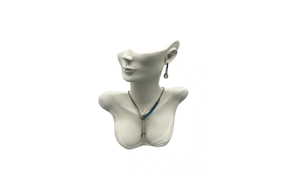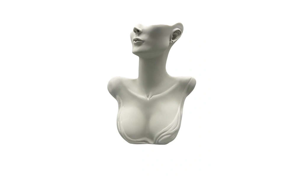 Yerli üretim polyester malzeme kullanılarak üretilmiş, dayanıklı ve uzun ömürlü bir yapıya sahiptir; Beyaz renk seçeneğiyle şık ve modern bir görünüm sunar, her türlü takı sergileme mankeni için idealdir; 33 cm yüksekliği ve 26 cm genişliği ile çeşitli takı türleri için yeterli alan sağlar, detaylı ve estetik bir sunum imkanı tanır; Platinyum kaplama özelliği sayesinde parlak ve göz alıcı bir parlaklık kazandırır, takıların daha dikkat çekici görünmesini sağlar;