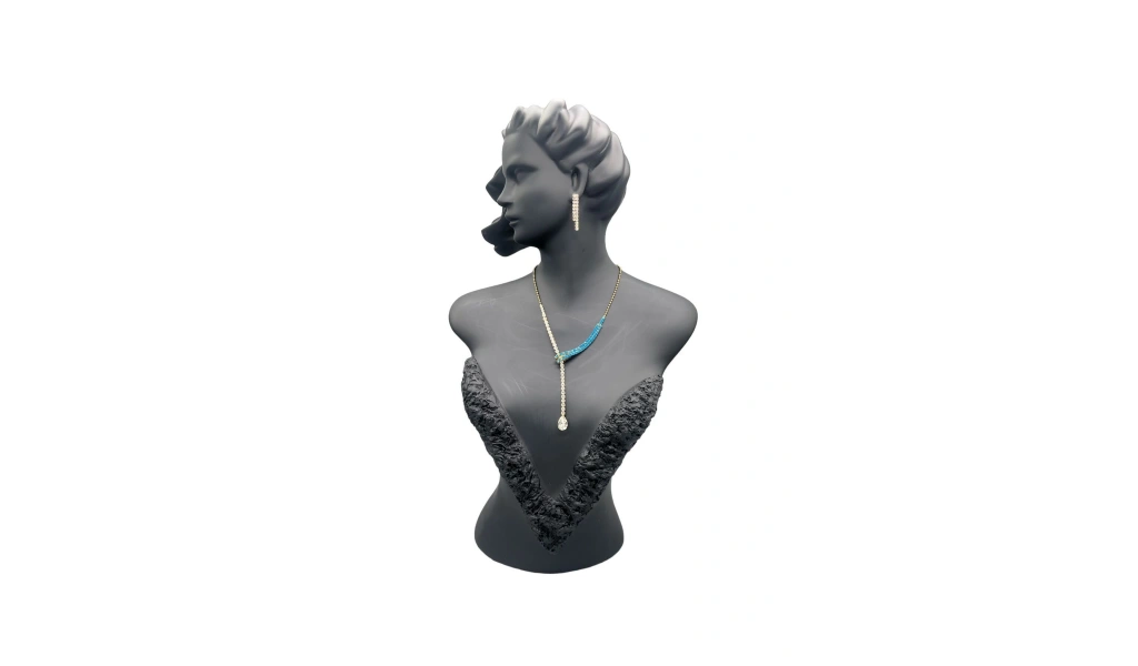 Ürünün Özellikleri: Malzeme: Polyester boyalı Boyalı Boyutları : Boy: 51 cm En: 28 cm Derinlik : 10 cm Renk: Siyah Açıklama: 1 adet kolye ve 1 adet küpe kombin takılarınızı sergileme ve fotoğraf çekim mankenidir.