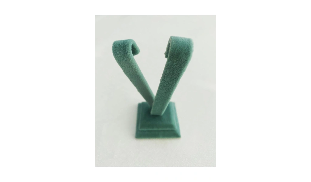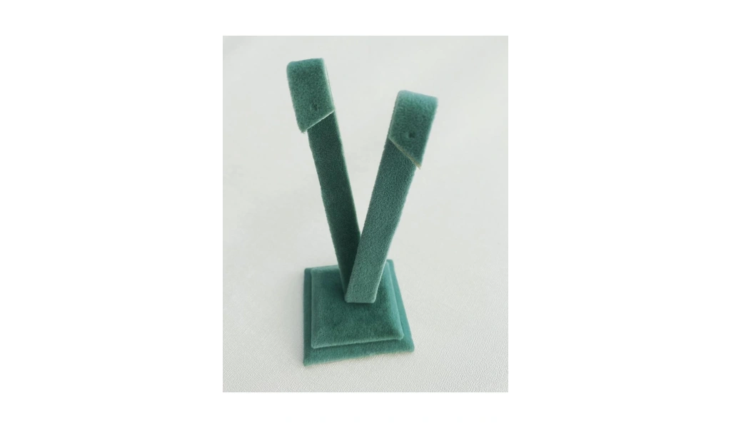 Malzemesi mdf üzerine süet kaplama Boyutları : Boy: 10 cm En: 4 cm Renk: Yeşil Kullanım Şekli : Küpe sergileme ve fotoğraf çekim aksesuarı