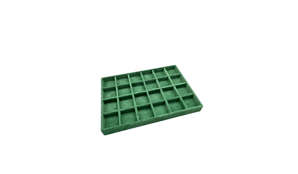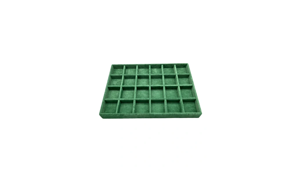 Malzemesi : Mdf üzeri süet kumaş kaplamadır. Renk : Yeşil ; Ürün Boyutları 24 cm - 34 cm Yükseklik : 3 cm ; Alt kısmı kuşe kağıt ile kaplanmıştır ; Bölmelerin ölçüsü 5 cm - 5 cm dir. ; Takılarınızı Ayrı Ayrı Gözlere Koyarak Daha Rahat Muhafaza Edebilirsiniz ;